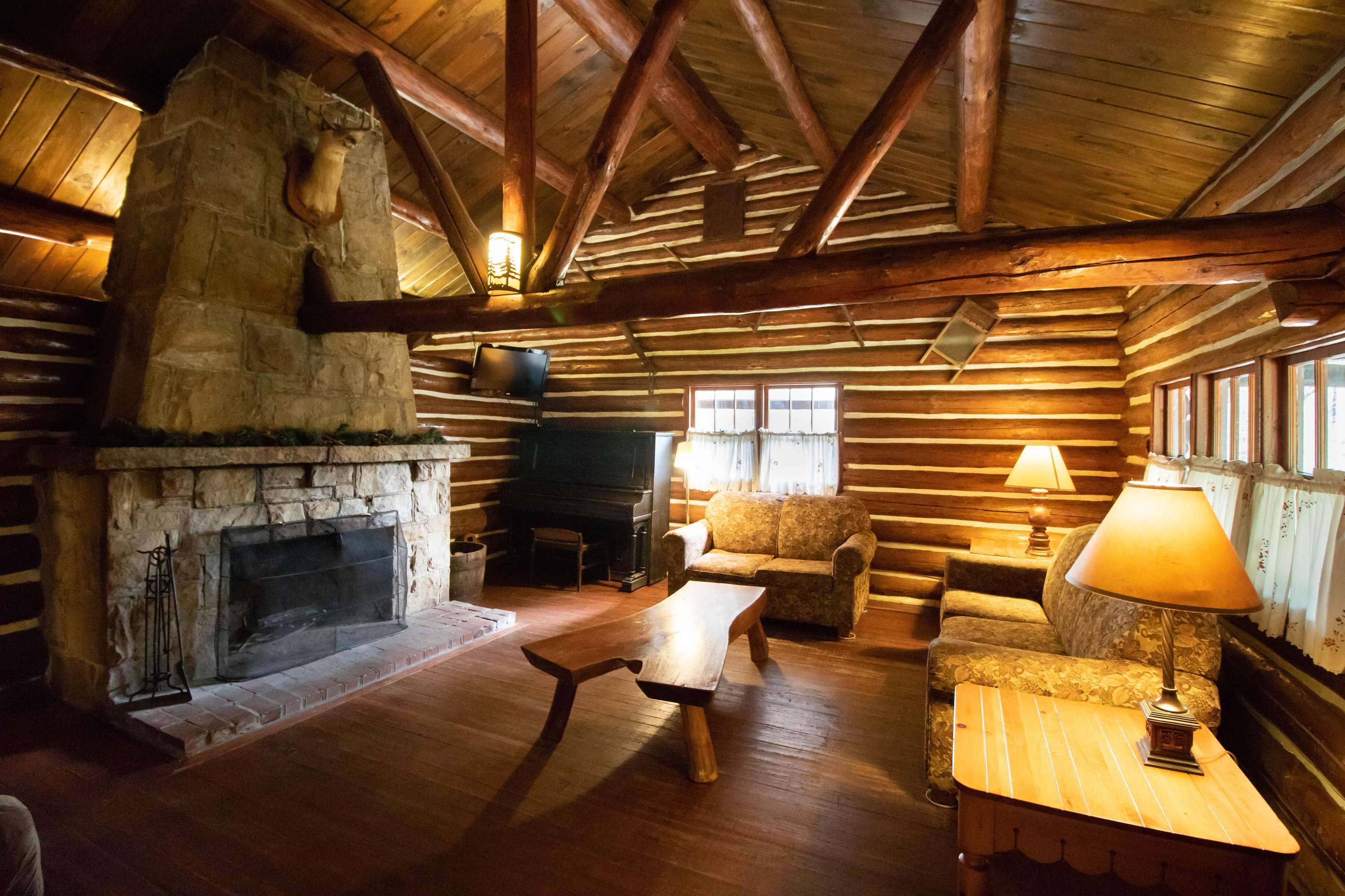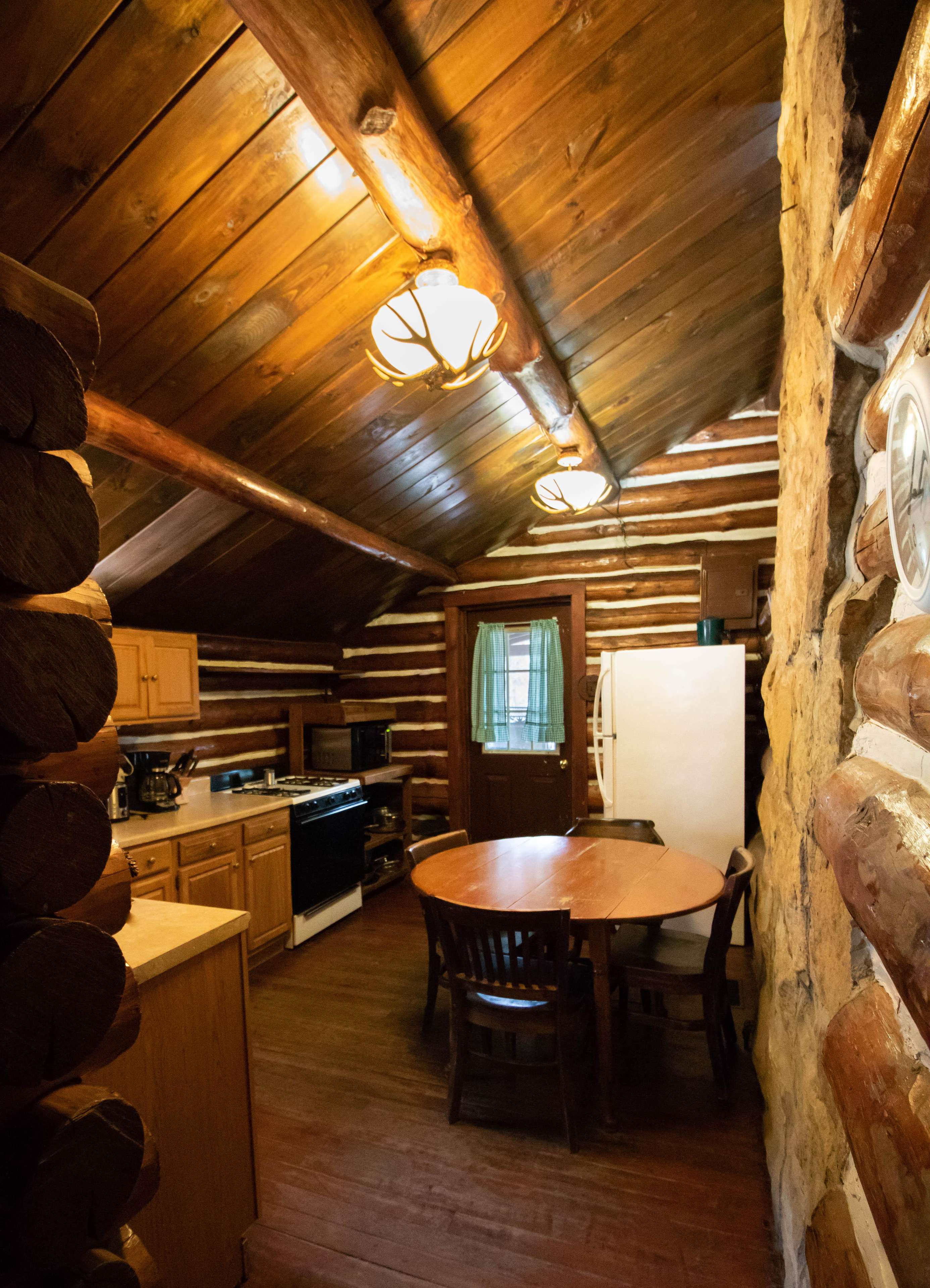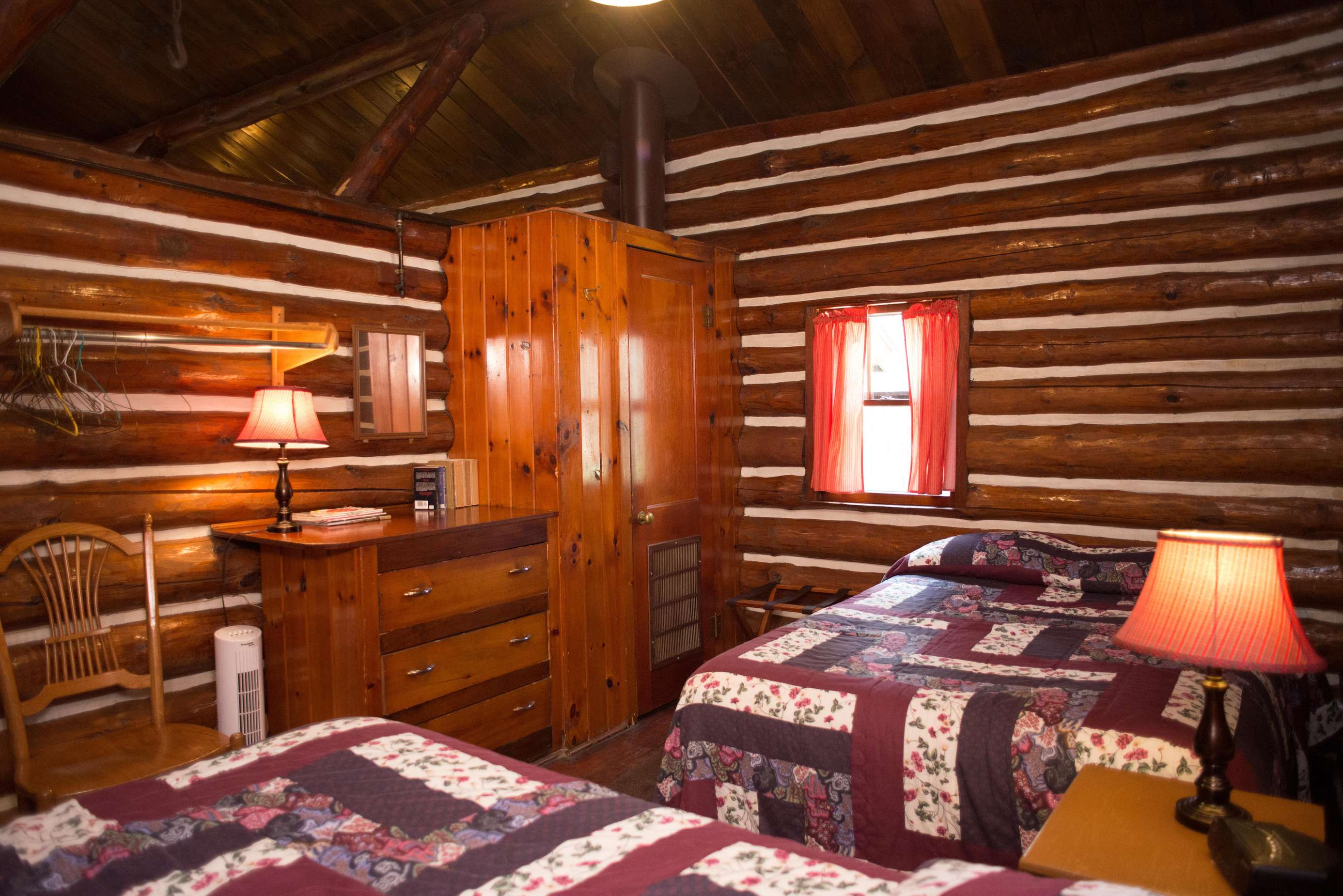 Cabin 16 is a spacious hand-hewn log cabin with a gorgeous stone fireplace, kitchen and bath. This two-bedroom cabin has plenty of room for up to eight guests. Cabin 16 has a large covered front porch with a deck that wraps around the side, picnic table, charcoal grill, and fire ring. It sleeps a maximum of 8 guests. From the first weekend in June through the last weekend of August, Cabin 16 is a Sunday-to-Sunday weekly rental. We require a 3-night minimum rental on Memorial and Labor Day weekends and only a 2-night minimum at other times.