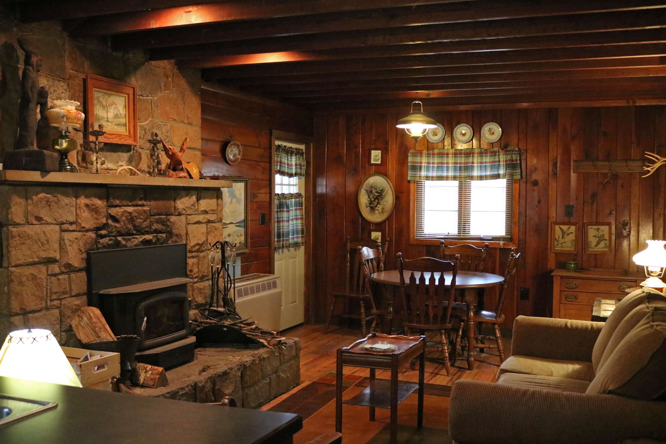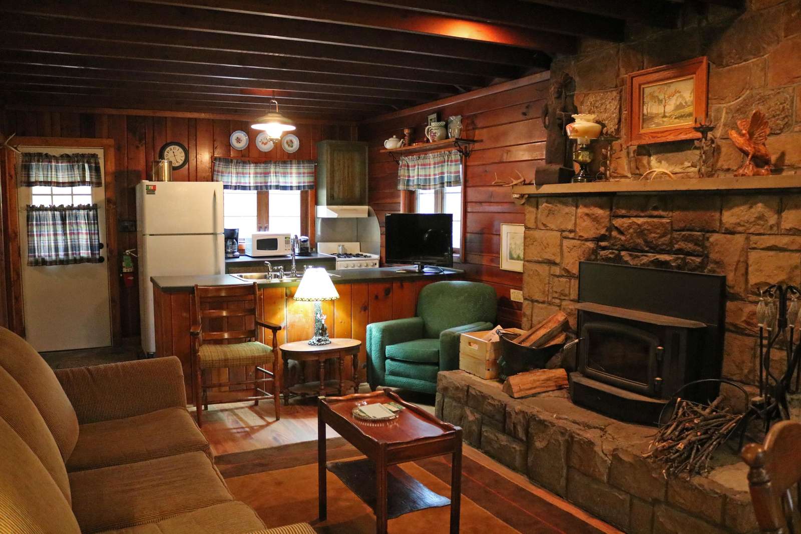 Cabin 6 features a full kitchen, bath, and living room with a wood-burning, stone fireplace along with two bedrooms. Outdoor space includes a covered porch, picnic table, charcoal grill, and fire ring. It sleeps a maximum of 7 guests. This cabin is open April thru the first week of December.